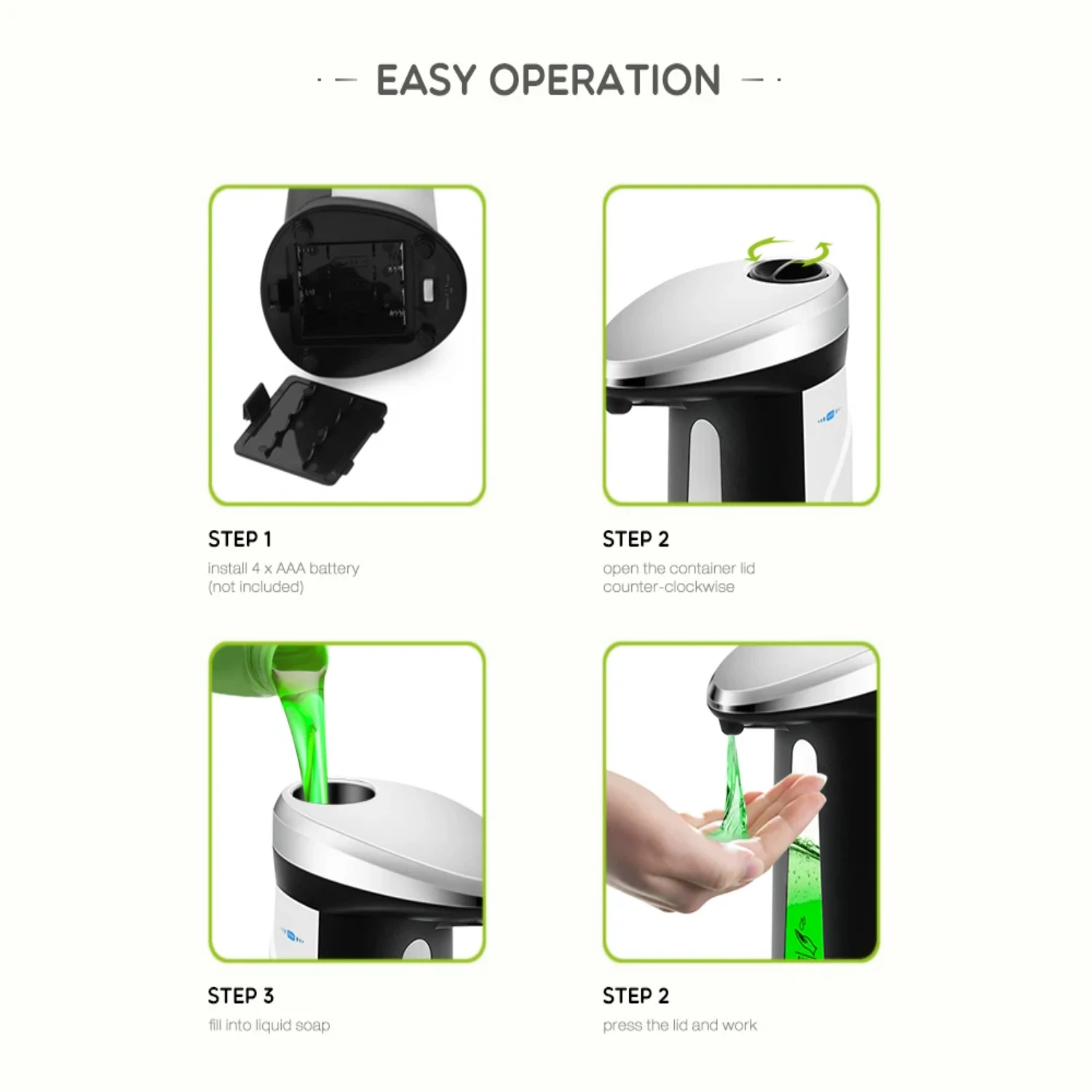 3. Experience the convenience of a hands-free soap dispenser with this 400ml Smart Sensor Touchless Soap Dispenser. Perfect for the office or public restroom, this dispenser is battery operated for long-lasting use.