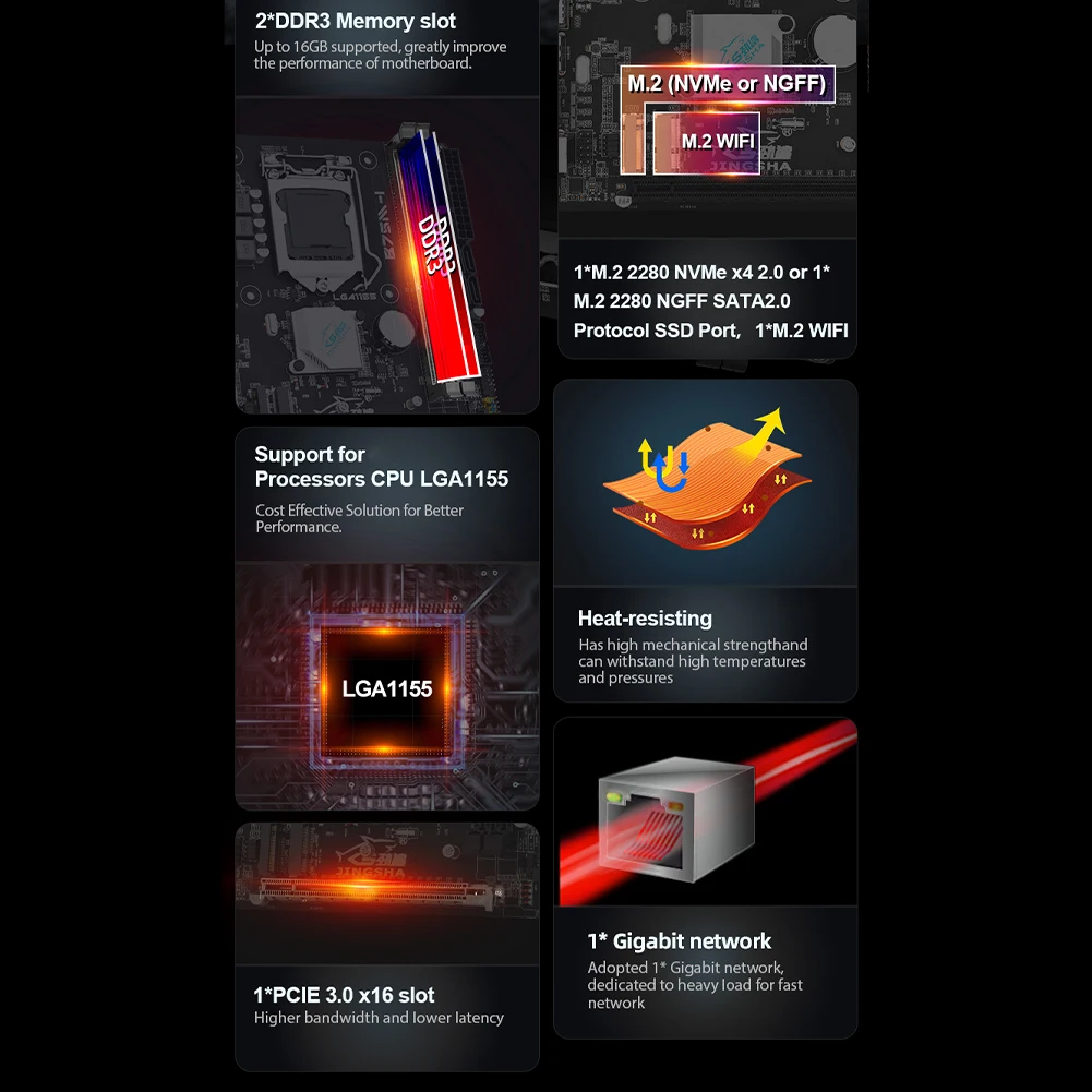 2.Efficient Expansion: Equipped with a PCI-E 3.0 X16 graphics card slot providing higher-speed graphics processing capabilities; supports three SATA 2.0 and one SATA 3.0 interfaces, balancing traditional storage with high-speed SSD expansion. Also features one M.2 NVMe/NGFF interface (supporting high-speed SSDs), further boosting storage performance.