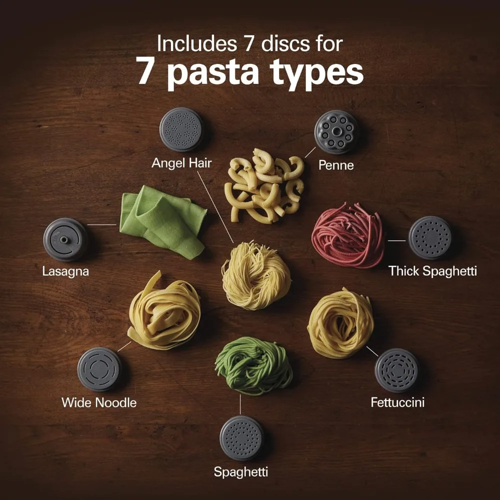 No more misplaced parts. Keep the 7 pasta discs right where you need them in the built-in storage drawer.