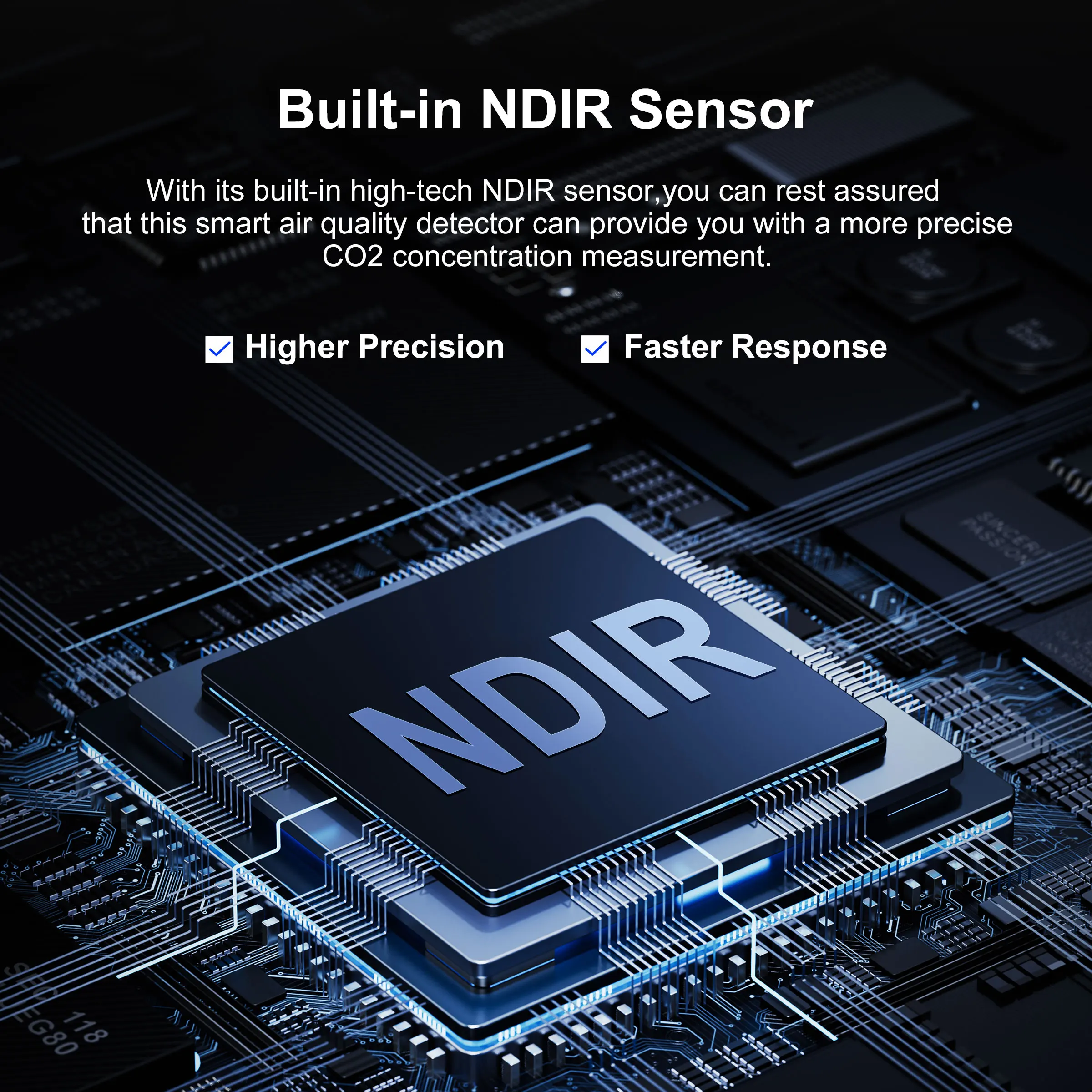 Unlike conventional CO2 sensors, the NDIR technology offers faster, more stable, and precise monitoring of CO2 concentration, enhancing your comfort, safety, and smart living experience.