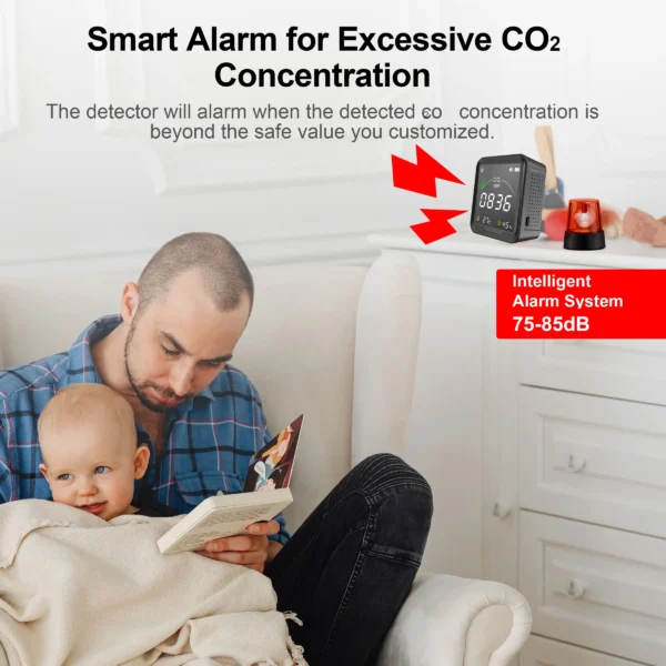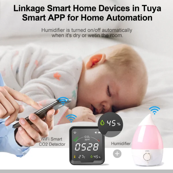 Easily integrate with Tuya smart devices to create customized scenes. For instance, link it to a smart widow pusher and, when CO2 reaches a warning level, it automatically opens the window. Temperature and humidity settings also available for a safer, smarter lifestyle.