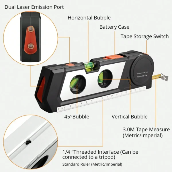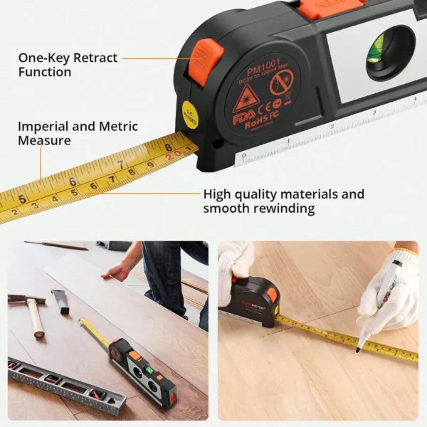 [4-In-1Multifunctional Lazer Level Tool] Integrated the triple-positioned leveling bubble, laser line level, 17cm/6” ruler and 3m/9.8ft measure tape into one small and portable home improvement tools.  The laser leveler could easily meet all the situations that requires a straight line or accurate measurement.