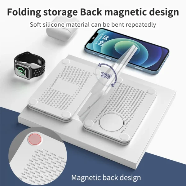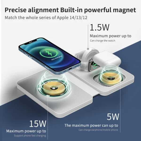 Magnetic three-in-one foldable 15w fast charging mobile phone battery charger suitable for mobile phones, watches, headphones,