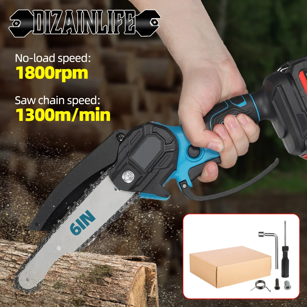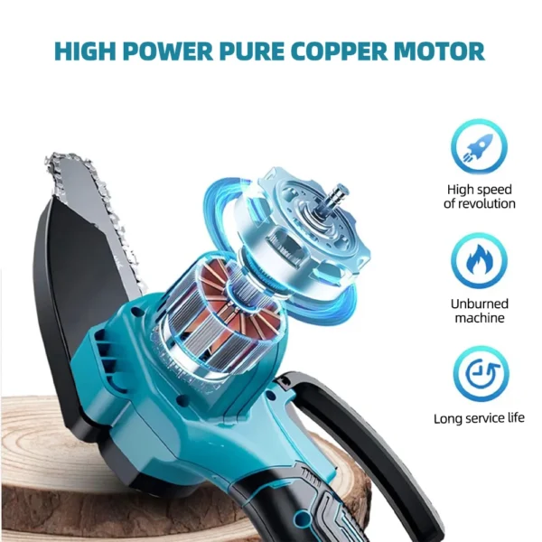 【UPGRADED COPPER WIRE HIGH-EFFICIENCY MOTOR】 -Mini chainsaw 6 inch cordless uses upgraded copper wire high-efficiency motor. Provides your tool with longer run-time, more torque, and more power which leads to less wear and tear