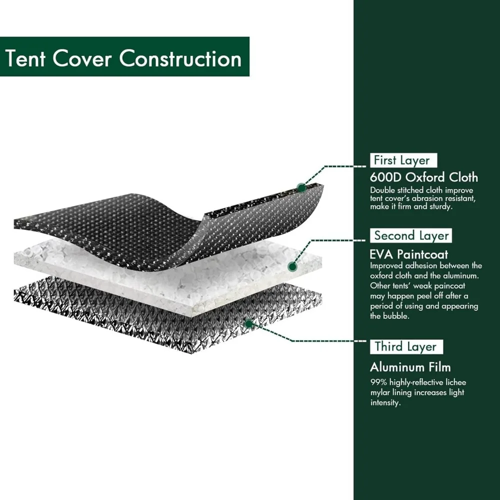 • 【DOUBLE SAVE ALL LIGHT】:The GA grow tent uses high density 600D Oxford cloth,and it is lined with 104%-reflective silver colored PET mylar.It is great to save all light into the tent.Heavy duty explosion-proof zipper and double stitching protect the tent from light leaking simultaneously.