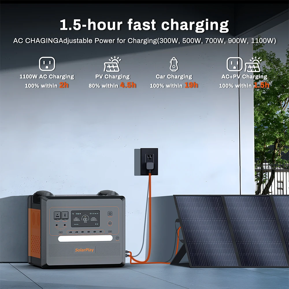 All + solar, fully in 1,8 hours. Solarplay charges to 80% in 1 hour and is fully charged in 1.5 hours (1100W AC + 500W solar panel). With 1100W AC alone, it takes 2 hours. Compatible with car connections (12V/24V) and generators.