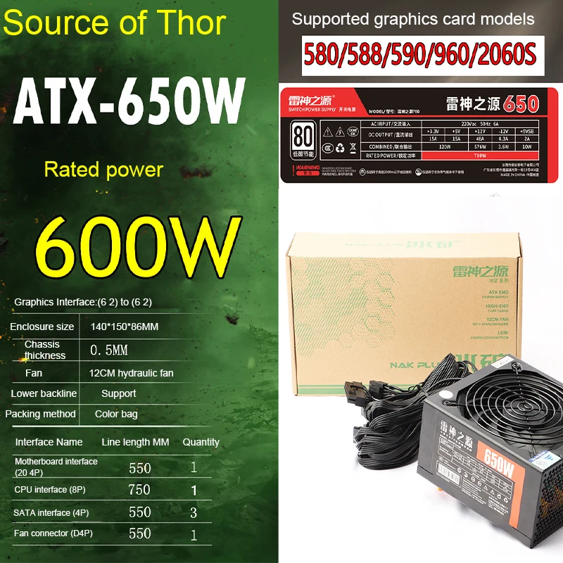 Thor Source ATX-600W Desktop Universal Computer Host Active Quiet Computer Power Supply