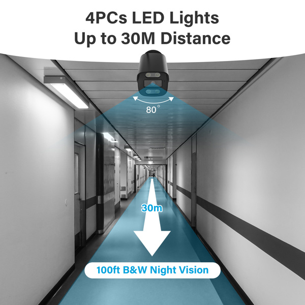 This 4K IP camera support 8MP 15fps/5MP 25fps etc a 65-100ft long-distance infrared night vision range, captures crystal clearer and sharper images and video, which is great for driveway, hallways, etc.