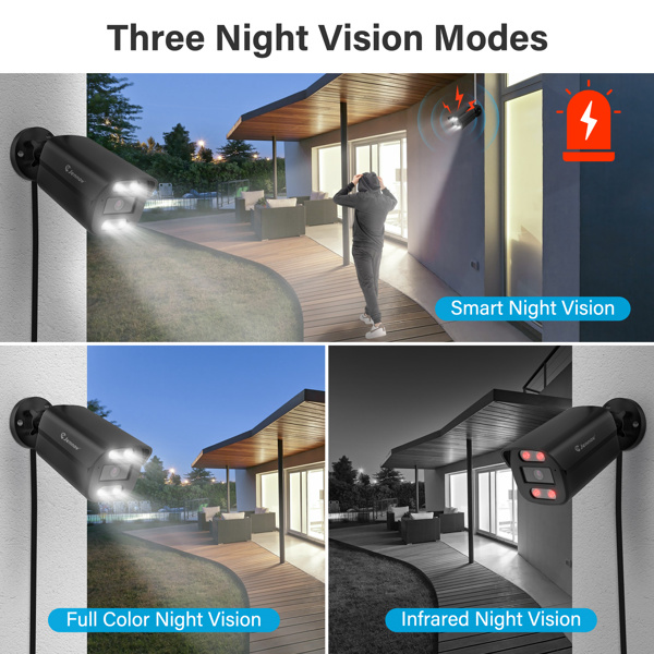 Three smart night vision modes provide clear full color or black-and-white pictures, even in complete darkness. Different modes can be selected through the app, or you can set the smart night vision to protect your property by setting the alarm time period