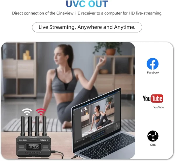 【USB VIDEO CLASS(UVC)】:Simplify your live streaming,CineView HE has added a brand-new feature on the receiver: UVC out. From the receiver to the computer, you can use a USB-C cable (user-provided) to transfer the footage received by the receiver to any third-party streaming platform on your computer for live streaming, such as OBS and YouTube, etc. No additional video capture devices needed, the new UVC feature is all you require to live streaming, anywhere and anytime.