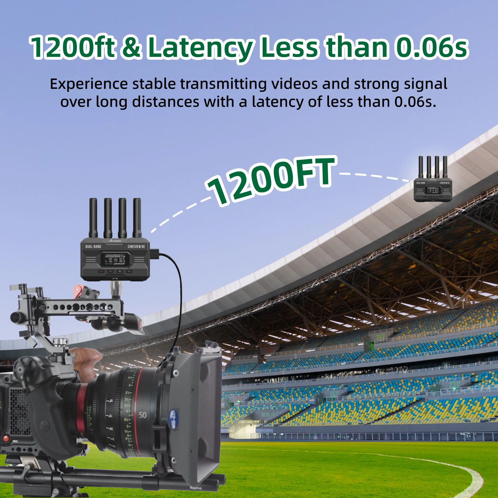 【1200FT/350M, 0.06S】: Control what you see within long-range & ultra-low latency ,CineView HE enables users to experience the stability of transmitting images and audio smoothly over long distance, even the size of a football pitch, with a latency of less than 0.06s.
