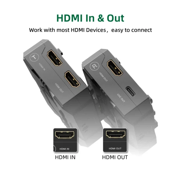 【HDMI IN & LOOP-OUT】: Conntect in multipule ways,CineView HE transmitter features one HDMI in and one HDMI loop-out, which can be connected to the camera and monitor, respectively. Whats more, HDMI loop-out has been upgraded to zero-latency lossless output.